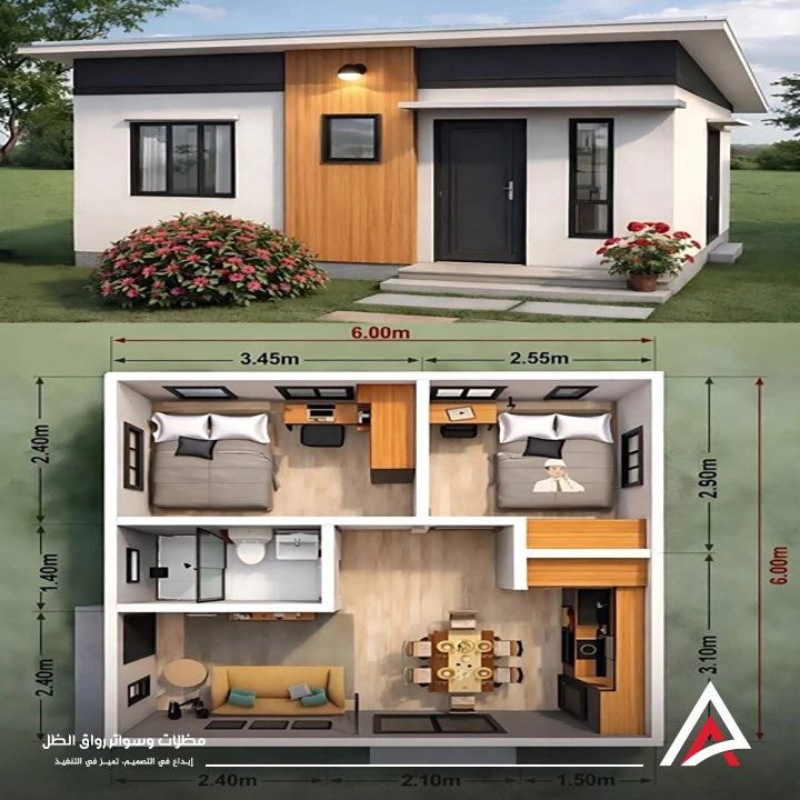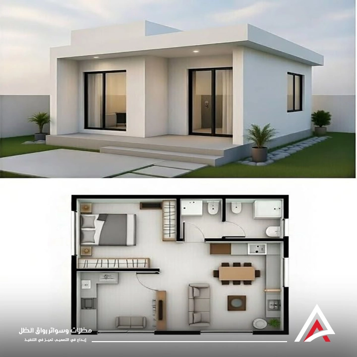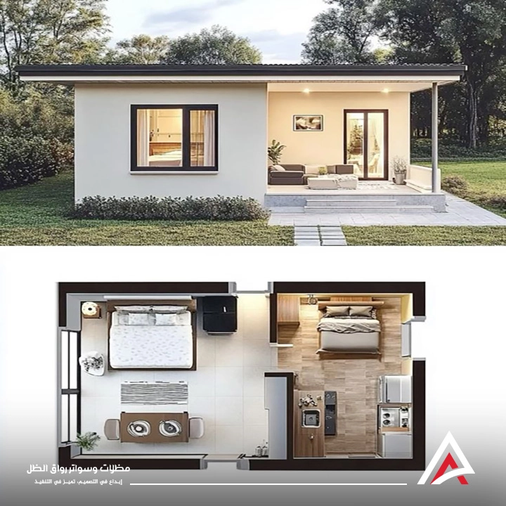 تصميم يتضمن مجلس استقبال ومنطقة تحضير الطعام ودورة مياه بلمسات فندقية.